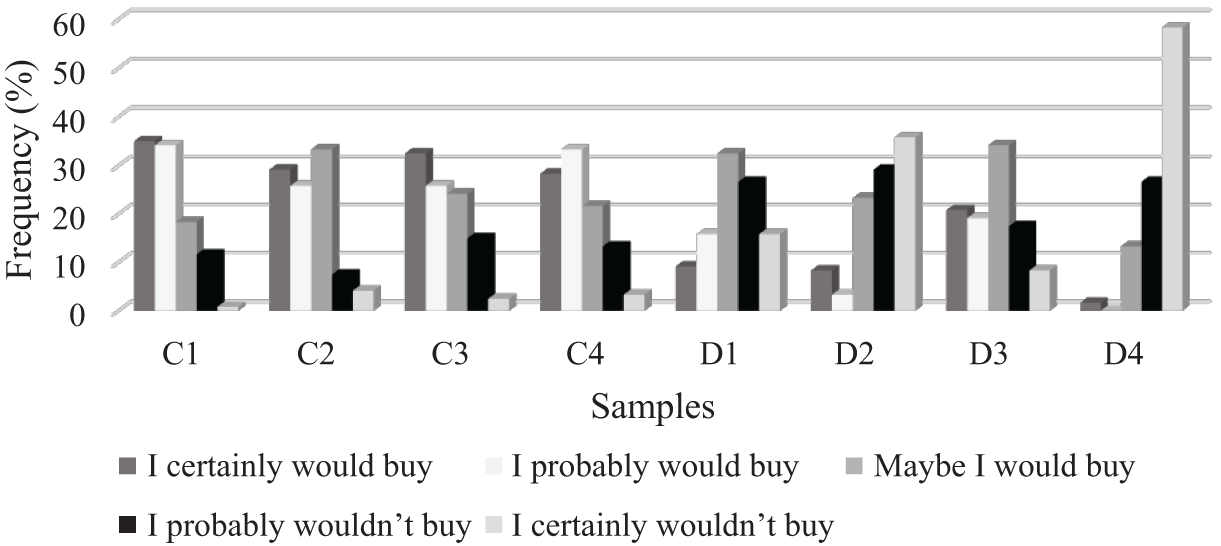 As described by Meilgaard et al. [13], the purchase intention test shows the consumers’ attitudes towards buying a product. Thus, Fig. 1 shows the frequency distribution of the purchase intention for all samples.