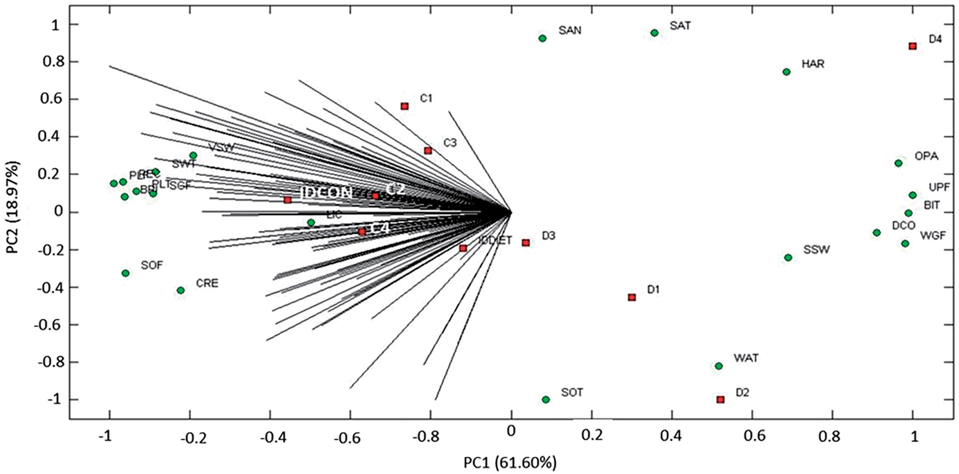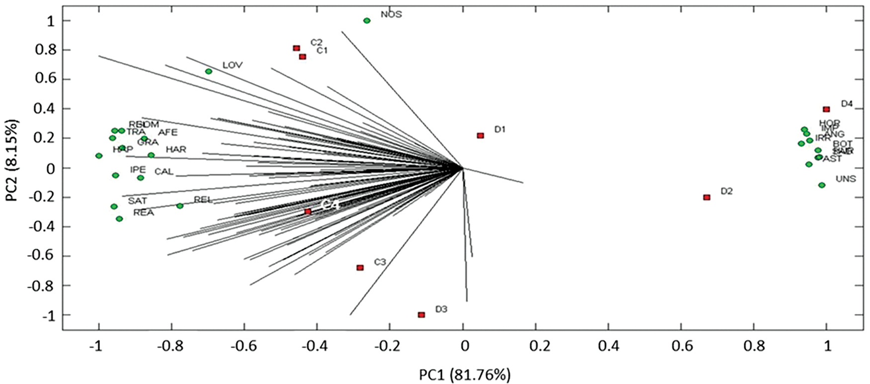 According to the external preference mapping for the Check-all-that-apply test and Emotion Measurement, sample C4 showed higher proximity with one positive emotion descriptor term and, C1 and C2 were close to positive emotions. In contrast, D2 and D4 were close to negative descriptor terms and emotions. These results are in accordance with acceptance tests, purchase intention, and just-about-right tests.
