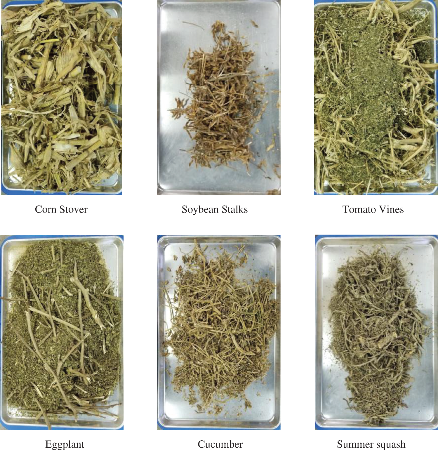 Fig. 1 shows corn stover samples consisting of large pieces of stalks and leaves. The soybean stalk samples included brittle stems and shriveled leaves. The eggplant biomass was mainly composed of crushed leaves and some thick and long wooden stems. Tomato vine is comprised of wooden stems and some chopped leaves. The bush-like cucumber and summer squash samples had thin, brittle stems and crushed leaves. Sawdust was taken at the pellet plant before grinding. The samples were kept in air-tight bags to minimize moisture uptake.