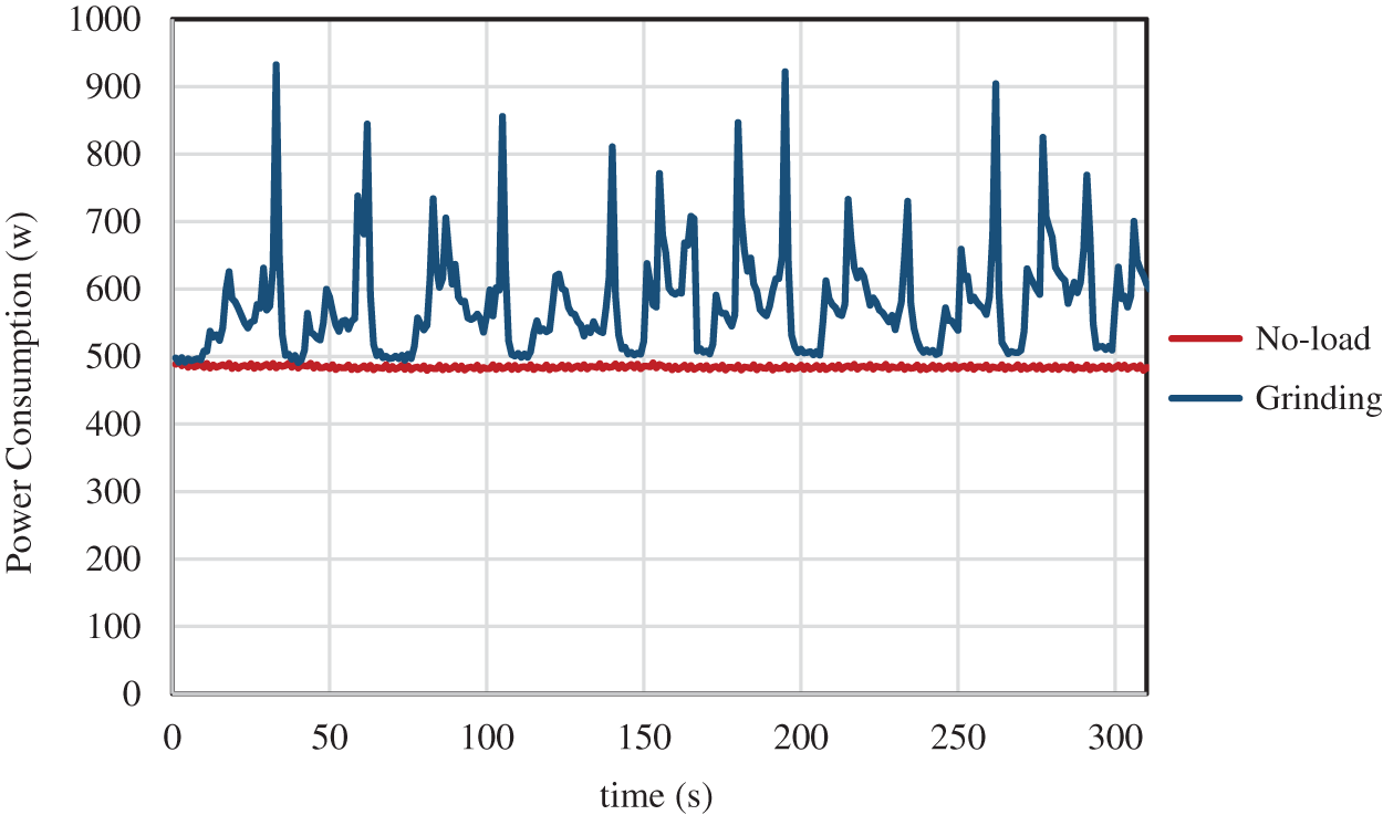 Fig. 2. Energy consumption in No-load and Grinding condition. Difference between No-load and Grinding condition represents the net specific grinding energy consumption (NSGEC).