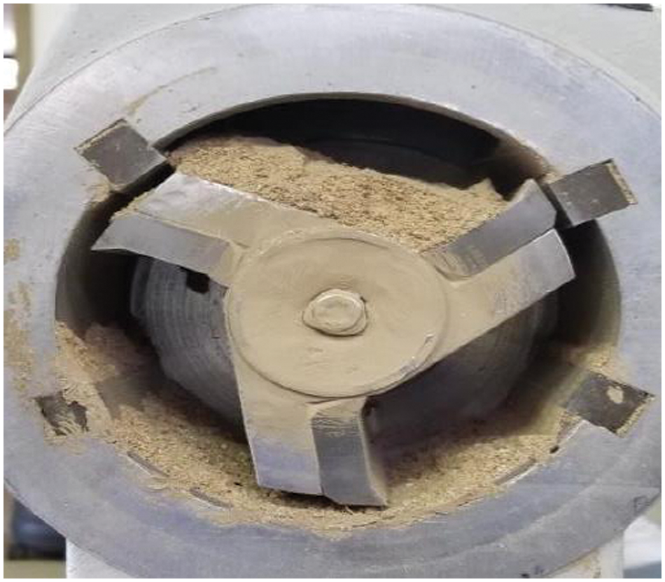 The sample of con stover and leaves exhibited considerable resistance to grinding due to the spongy and elastic nature of their stalks. The brittleness of the tomato vines led to the easiest grinding among all samples. Grinding tomato vines and eggplant samples resulted in the highest amount of dust generated, while sawdust produced the least during the process. The slenderness and brittleness bush-type of cucumber and summer squash samples resulted in the least resistance to grinding. Upon cessation of the in-flow, most of the samples were successfully cleared from the grinder cavity. However, an exception was noted with corn stover, summer squash, and eggplant samples, where significant amounts of materials remained within the cavity (Fig. 4). This accumulation of these samples led to an overcurrent situation, highlighting the unique challenges posed by their mechanical strength during the grinding process.