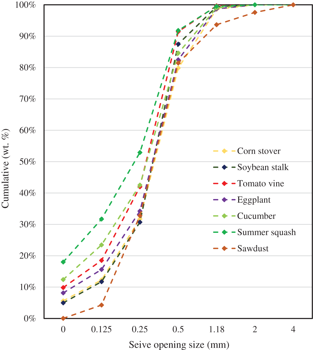 Fig. 5. Cumulative particle size distribution of corn stover, soybean stalk, tomato vine, eggplant, cucumber, summer squash, and sawdust sample according to ANSI/ASAE standard S319.4 (ASAE, 2008b).