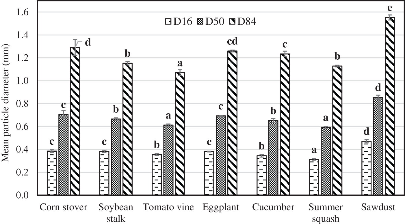 Fig. 6 shows the distribution of particle size specifying the mean particles size D50, D16, and D80. D80 represents that 80% of the particles are below the size on vertical axis. The result of the mean particle size analysis shows that all tested agricultural residues have significantly smaller particles compared to sawdust samples after grinding. Among agricultural residues, the ground summer squash and tomato vine samples show the lowest values for all particle sizes. The smaller particles are difficult to handle.