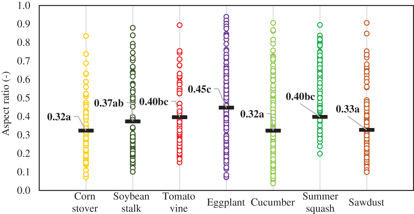 Fig. 7. Aspect ratio of the ground corn stover, soybean stalk, tomato vine, eggplant, cucumber, summer squash and sawdus.