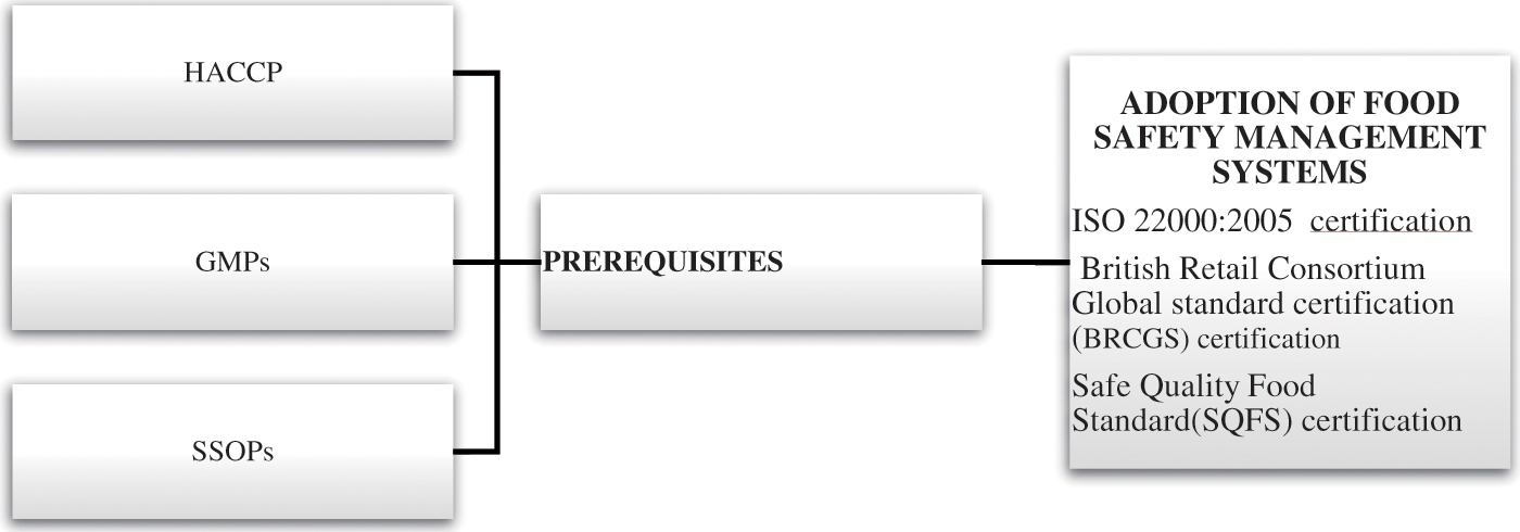 Prerequisites are those conditions that an organization must meet before any standard can be implemented and are set depending on the segment of the food chain such as Good Agriculture Practices (GAP), Good Laboratory Practices (GLP), Good Hygiene Practices (GHP), Good Manufacturing Practices (GMP), among others [4]. The basic standards or requirement that should be in place in an organization before any FSMS is installed are the HACCP plan based on the codex Alimentarius principles as discussed by [4] and [5], whereby during the implementation of FSMS, an organization should have a correct examination of the prerequisites, how the GMP and SSOP’s have been developed and implemented as well as food handlers training and HACCP plans. Reference [6] were of the view that for an HACCP plan to be developed, GMP and SSOP’s should be in place first as they are the building blocks to HACCP plan. This is as a consequence of HACCP plan depending on the hygienic design and maintenance of appliances and facilities, control of procedures, conservation of sanitation, and training all of which require investment so as to ensure safe food.