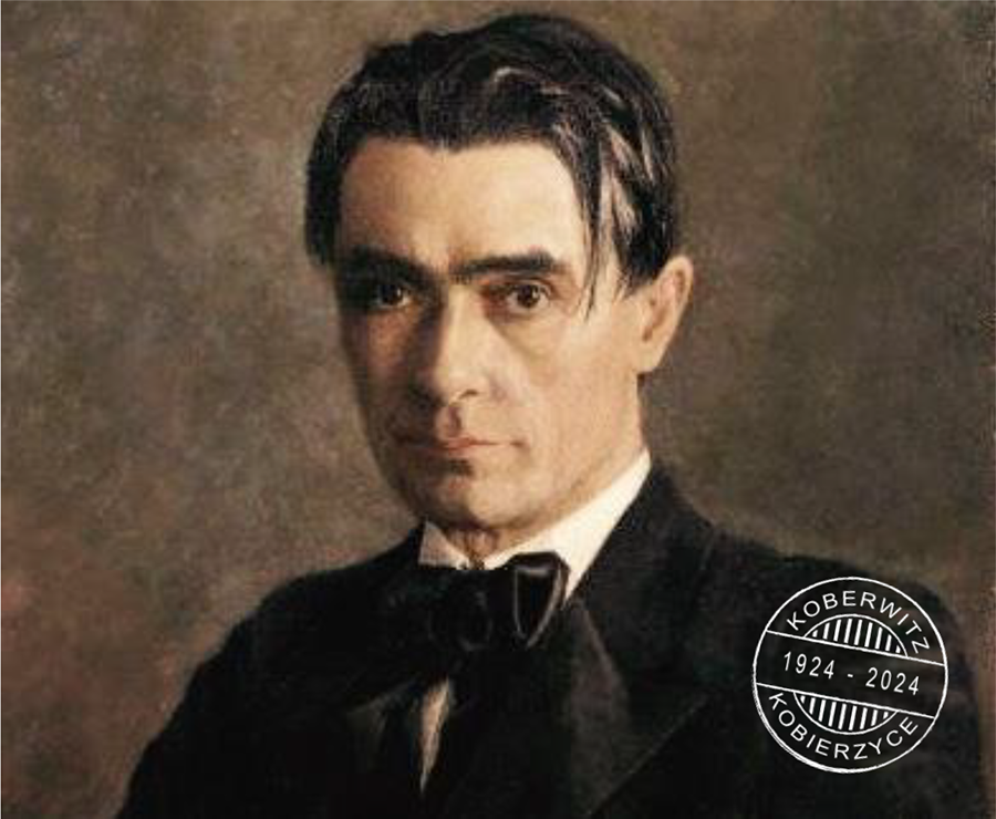 Fig. 1. New Age philosopher Dr. Rudolf Steiner laid the foundations in 1924 at Koberwitz for an agriculture differentiated by a reliance on biology rather than synthetic chemistry (Image artist: D Huschke, 1906, photo: J Paull, Koberwitz centenary logo: Wiki Commons, CC-BY-04).