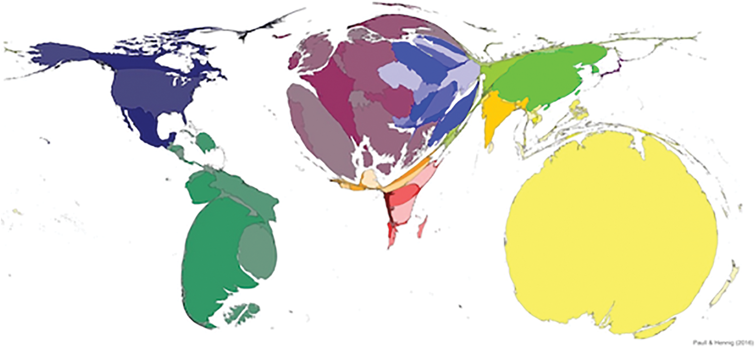 Fig. 2. World Map of Organic Agriculture, cartogram with countries resized proportionate to their organic agriculture hectares [14].