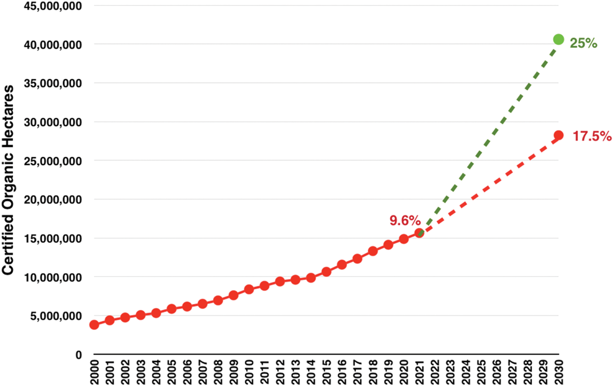 Fig. 4. Organic agriculture of the European Union (certified hectares) has grown at 6.7% pa in the years from 2000 to 2021, the historical growth rate is projected to 2030 (appears as red dotted) and growth to achieve 25% organic by 2030 (appears as green dotted) (data 2000–2021: fibl.org).
