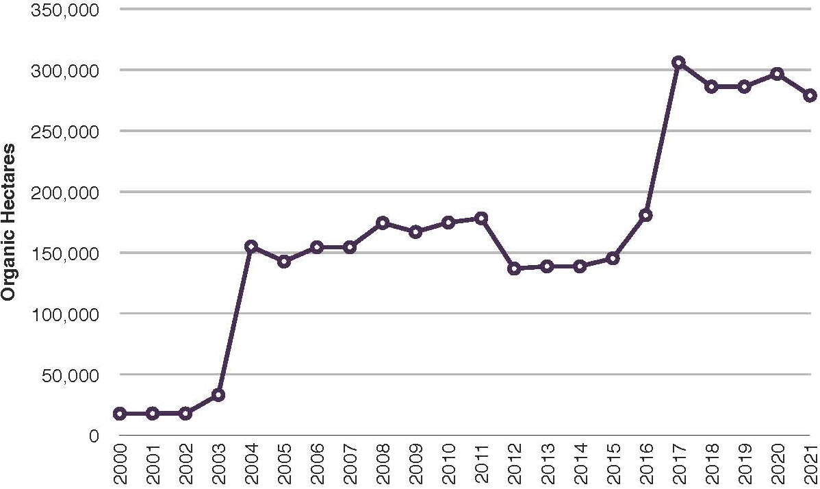 The growth of organics in Tunisia over the past two decades has been of a stop-start variety rather than a steady increase. Data have been reported from the year 2000. The data indicate overall growth; after a low and slow start, there have been two strong growth spurts, each followed by growth plateaus (with some recidivism within those plateaus). The present plateau dates from 2017, with a peak in 2017 and some backsliding since then (Fig. 4).