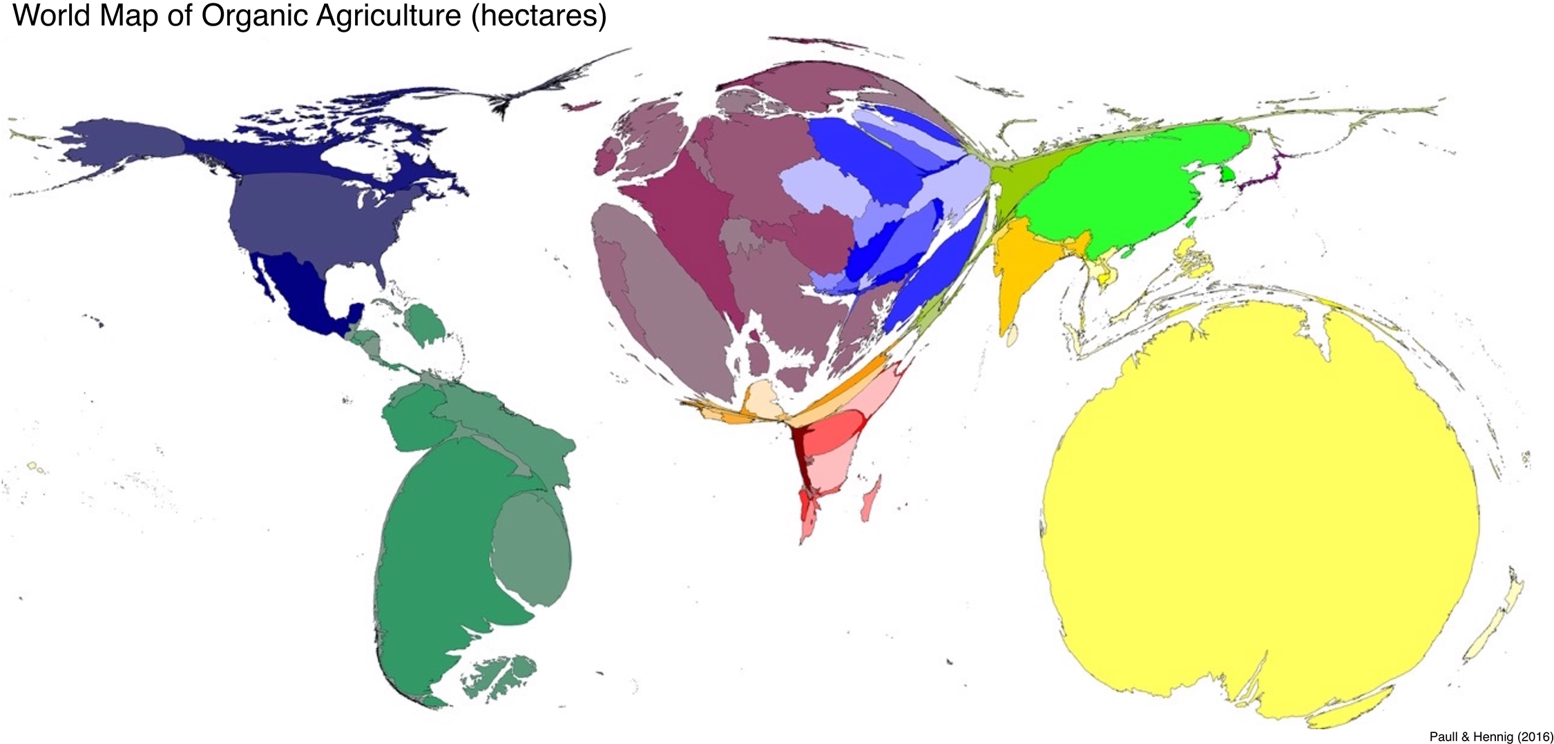 Fig. 5. World map of organic agriculture (a density equalising map); Africa is the ‘disappearing continent’ [11].