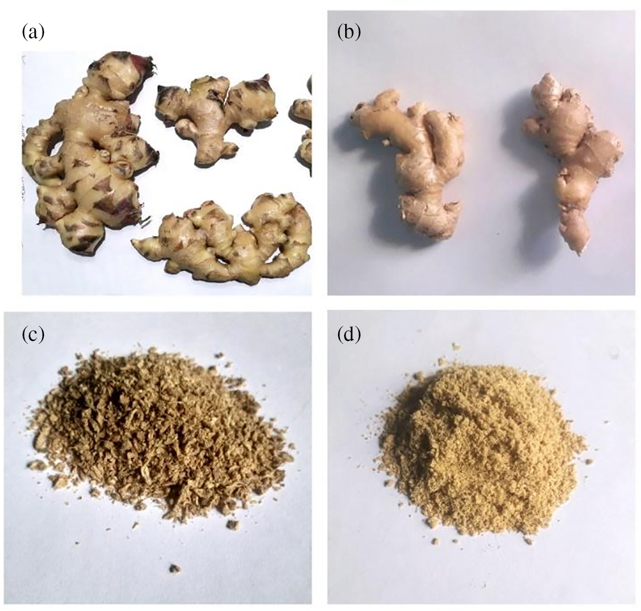 Fig. 1. Collected Zingiber officinale samples and powder form after processing: a) Fresh rhizomes of Zingiber officinale Chinese cultivar (CG), b) Fresh rhizomes of Zingiber officinale Sri Lankan cultivar (TG), c) Powder formed after grinding dried Zingiber officinale Chinese cultivar (CG), and d) Powder formed after grinding dried Zingiber officinale Sri Lankan cultivar (TG).