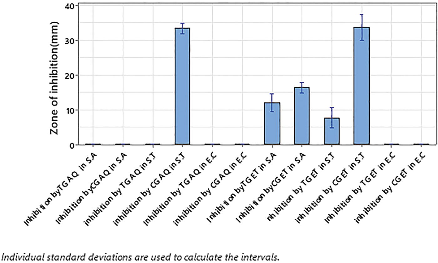 Fig. 2. The Zone of Inhibition (mm) formed by all types of extracts of ginger variants is shown in an interval plot. TGET-Traditional Ginger ethanol extract, CGET-Chinese ginger ethanol extract, TGAQ-Traditional Ginger Aqueous extract, CGAQ-Chinese ginger Aqueous Extract S.A-Staphylococcus aureus, S.T-Salmonella typhi, E.C-Escherichia coli.